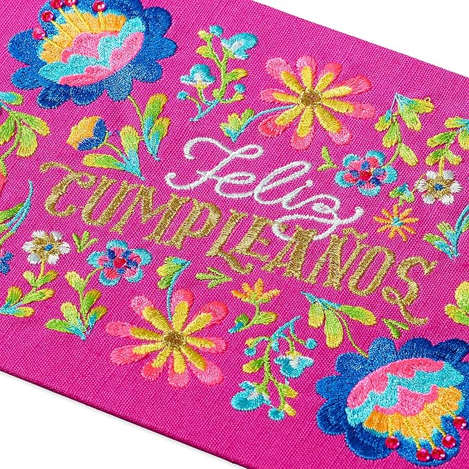 Celebrate their special day with color, culture, and craftsmanship. This stunning card bursts with embroidered florals in vivid jewel tones, set against a rich magenta textile backdrop. The words “Feliz Cumpleaños” are beautifully stitched in gold and white thread, surrounded by radiant blossoms, delicate leaves, and folkloric charm.