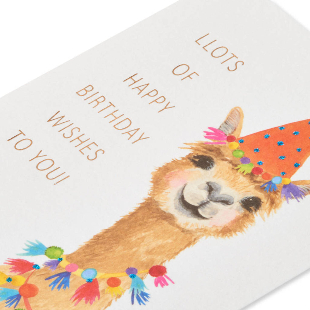 Send llots of birthday cheer with this playful llama card! Featuring an adorable llama decked out in a festive party hat and colorful tassel garland, this card sparkles with touches of glitter and bright, cheerful details. Perfect for animal lovers and anyone who appreciates a fun, lighthearted greeting.