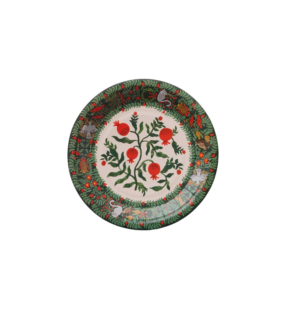 Deck your holiday table with these delightfully festive small plates, adorned in charming Christmastide illustrations and seasonal greenery. With hand-painted pomegranates at the center and whimsical motifs like doves, wreaths, and fiddles dancing around the border, they make every gathering feel just a little more magical.