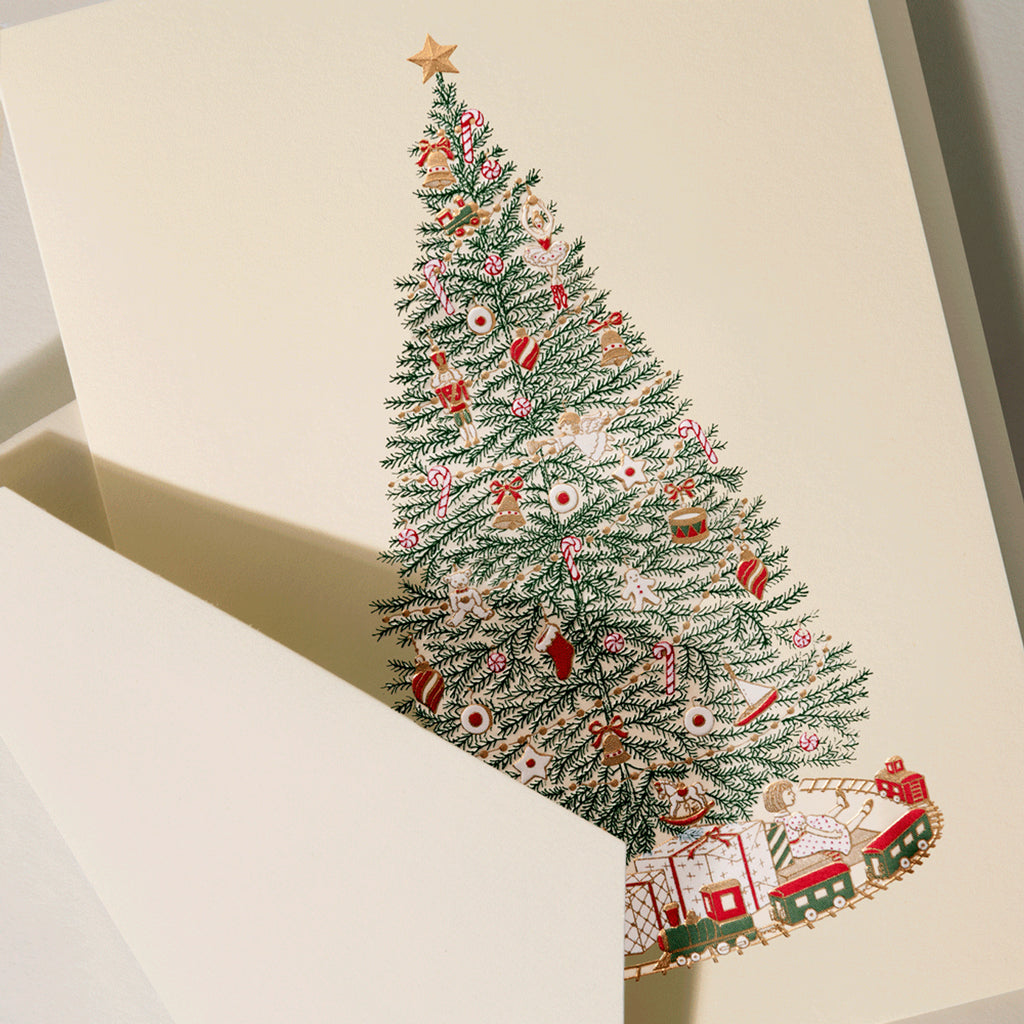 A timeless tribute to holiday wonder, this hand-engraved Christmas tree brims with festive nostalgia. Delicately adorned with candy canes, cookies, toy drums, and ribbon-tied gifts, the evergreen sparkles with golden foil and rich red accents. At its base, a classic toy train circles wrapped presents, evoking cherished memories of Christmas morning magic.