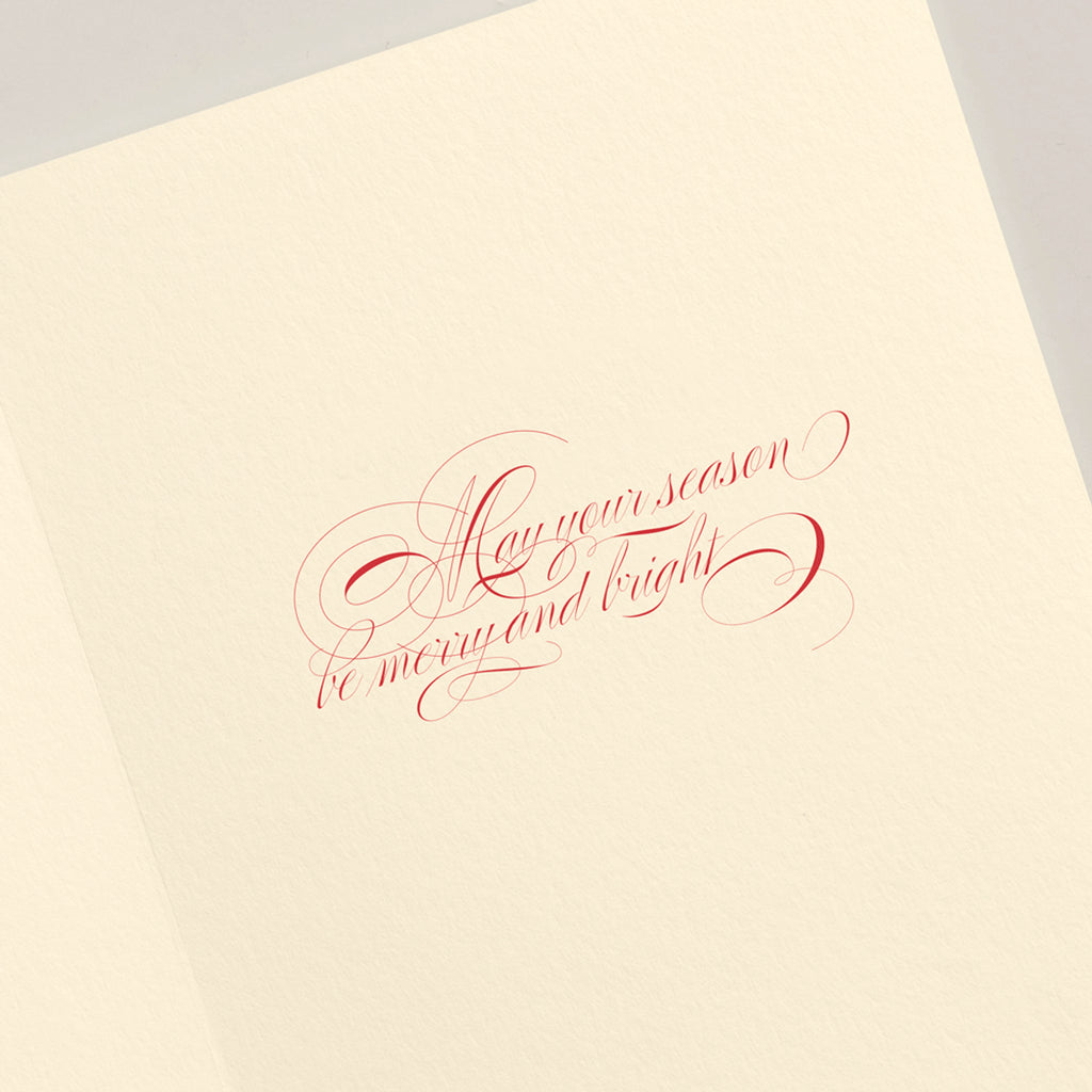 Printed on Crane’s signature ecruwhite paper, this luxurious boxed set of 10 folded notes features exquisite detail and a deep green envelope liner, adding sophistication to every seasonal message. The design is hand-engraved with precision, preserving a century-old craft for modern-day joy.