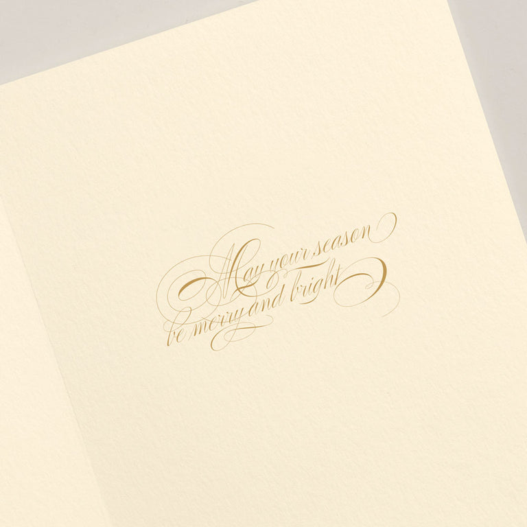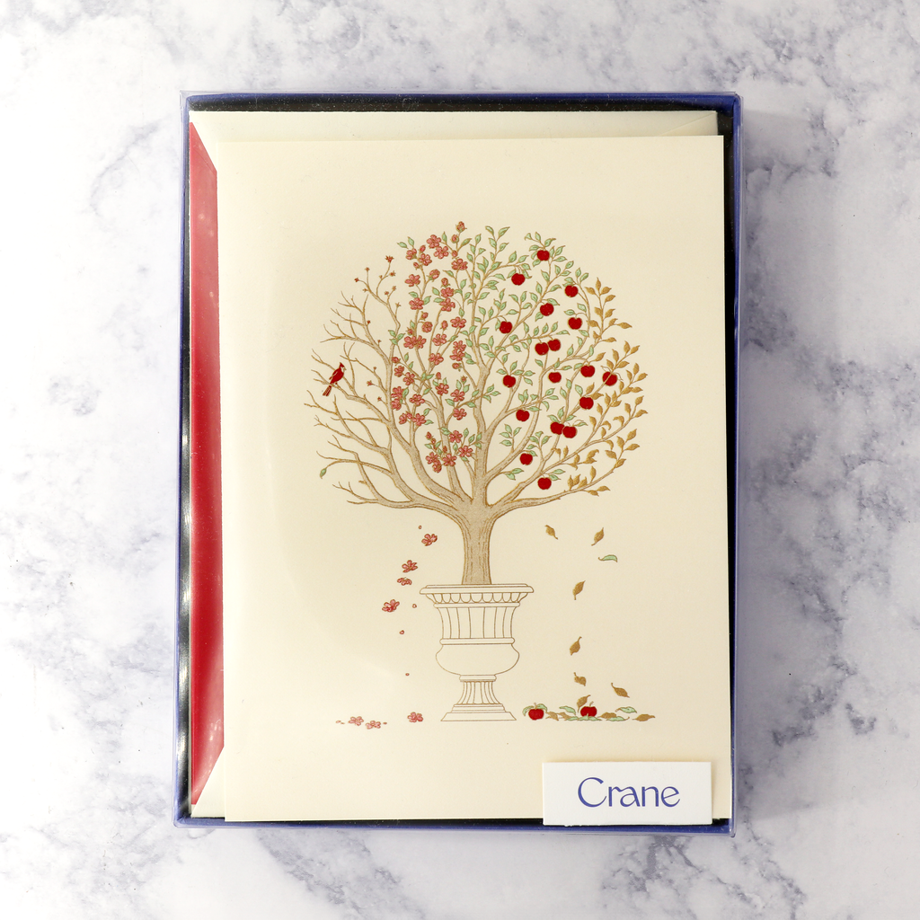 Celebrate the beauty of the seasons with this elegant holiday note set from Crane. Hand-engraved on creamy ecru paper, the design features a flourishing apple tree in a classical urn, its branches transitioning from winter bare to spring blossoms, to summer fruit, and finally to autumn leaves. Delicate red accents, fluttering petals, and perched cardinals bring warmth and depth to this timeless scene. A refined choice for holiday greetings, thank-you notes, or seasonal correspondence.