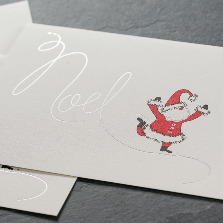 Celebrate the season with a joyful swirl of holiday cheer. This charming hand-engraved card features a jubilant Santa skating gracefully across the snowy page, his trail spelling out “Noel” in elegant, sweeping script. Rich in detail and personality, it’s a delightful balance of whimsy and sophistication.