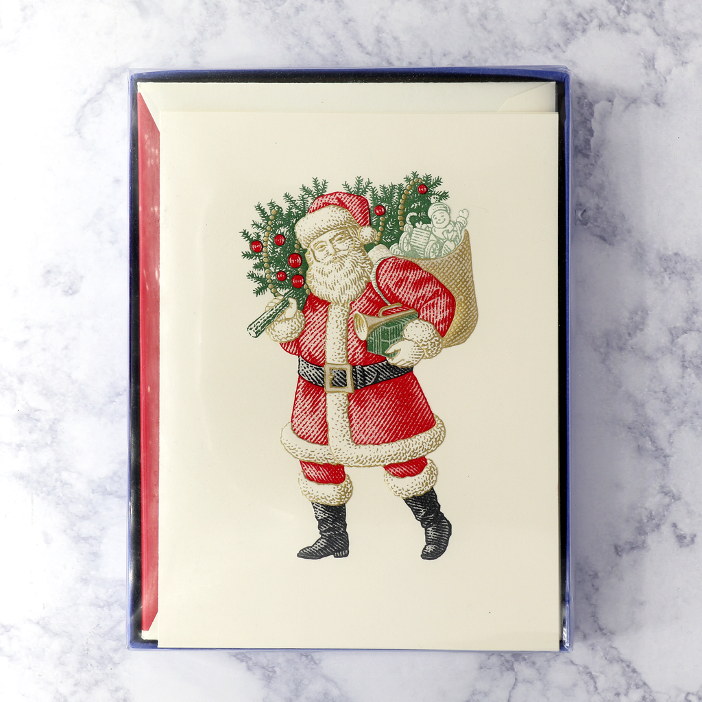 Jolly and timeless, this engraved Santa carries the spirit of Christmas in every finely detailed line. Dressed in his classic red suit, he totes a sack brimming with presents, evergreens, and cheer—ready to deliver joy to every corner of your holiday list. Meticulously hand-engraved on warm, heavyweight ecru paper, each card is a celebration of old-world craftsmanship and festive nostalgia.