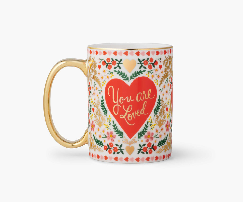Start your morning with a heartfelt reminder. The Juliet Porcelain Mug features Rifle's signature floral illustrations wrapped around a bold red heart that reads "You are Loved" a daily affirmation in the form of your favorite cup. With delicate pink blossoms, golden accents and a shimmering metallic gold handle and rim, this 16 oz mug transforms even a simple coffee into something beautiful.