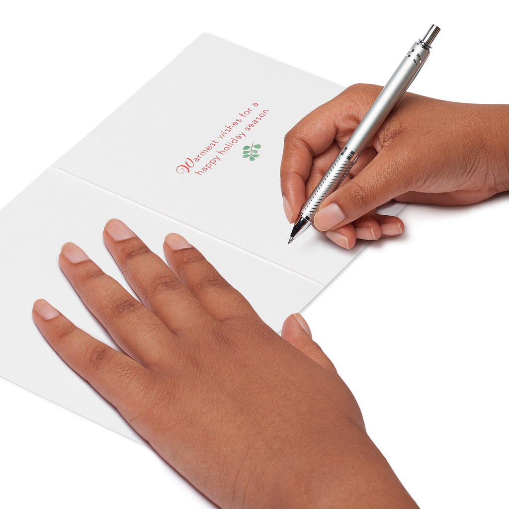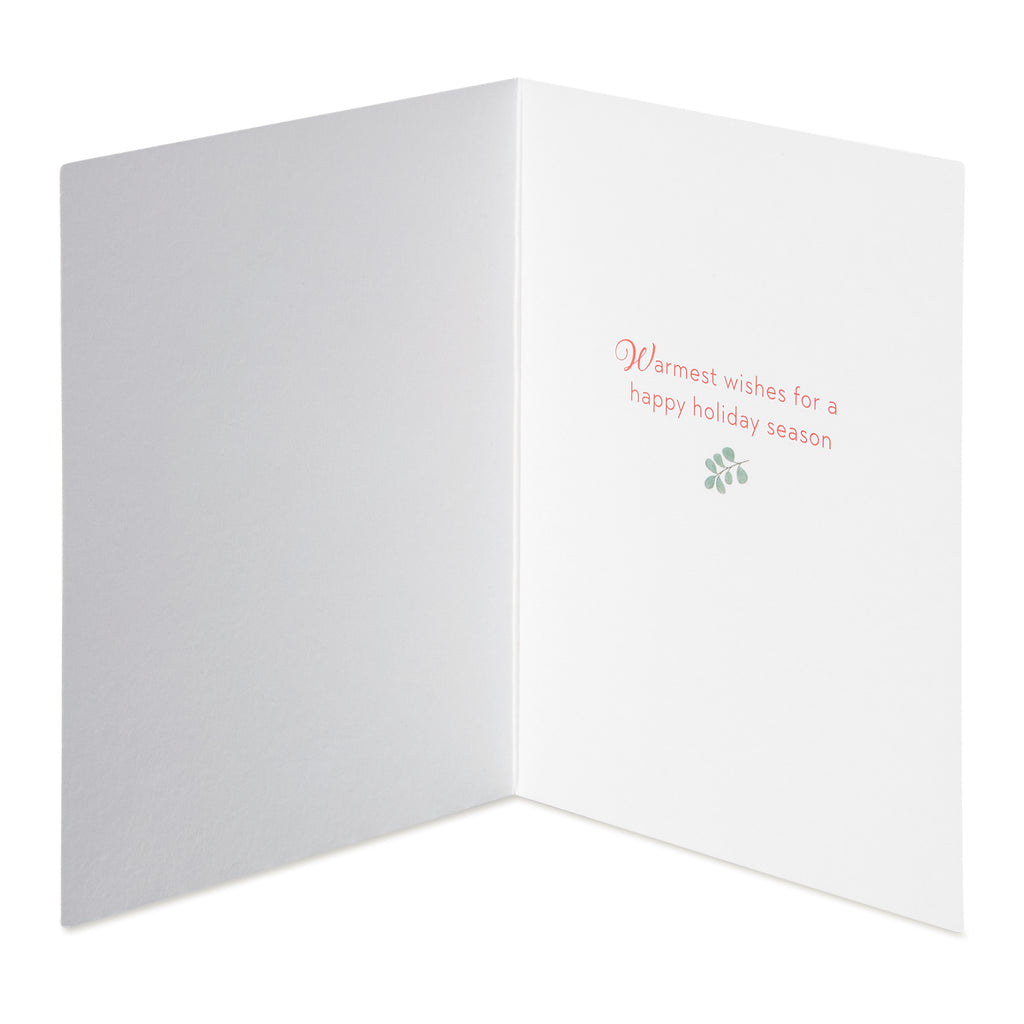 Each card is a work of art—thoughtfully detailed and richly colored, with delicate holiday greenery and subtle texture. Inside, a warm seasonal sentiment leaves space for your personal note, making it perfect for friends, family, colleagues, or clients.