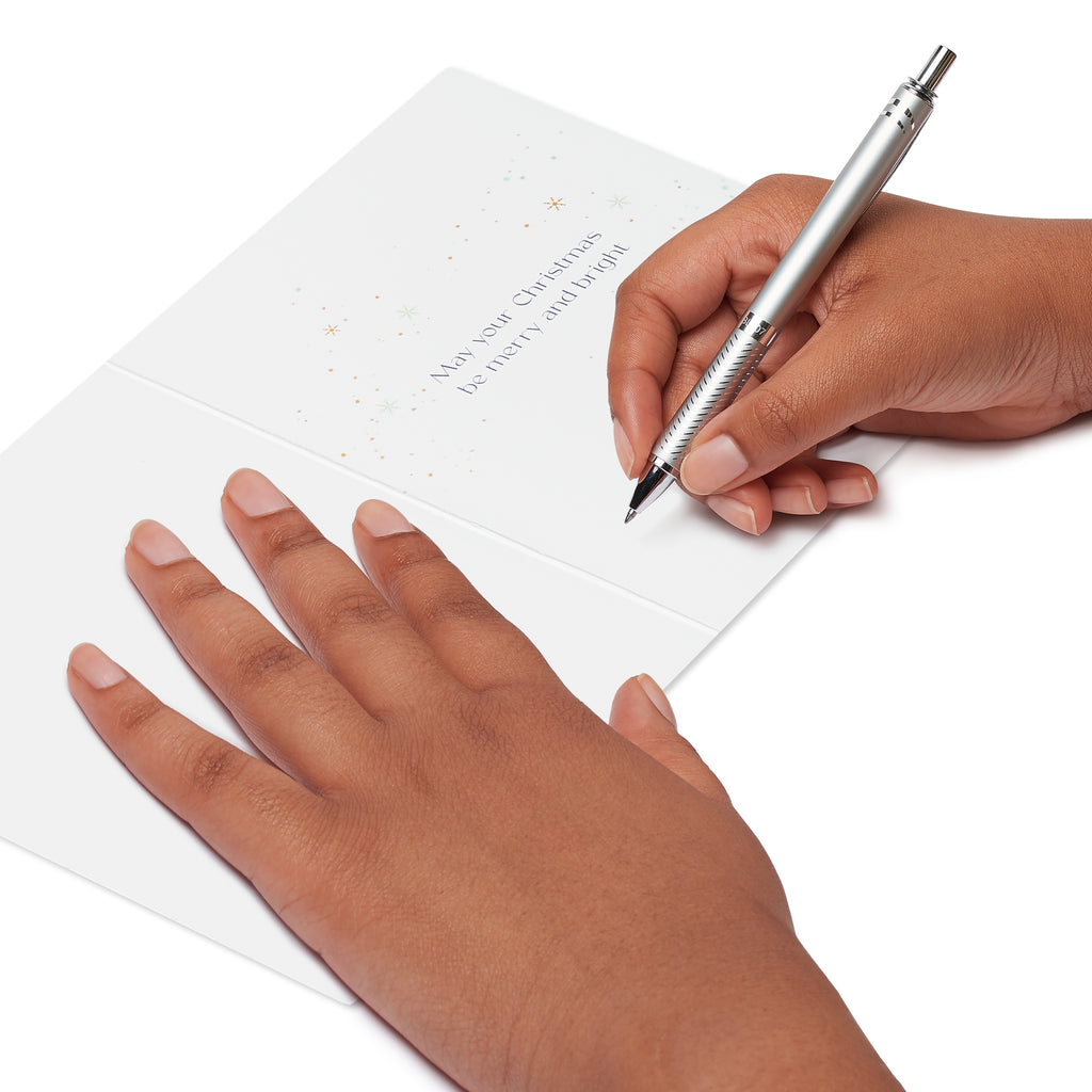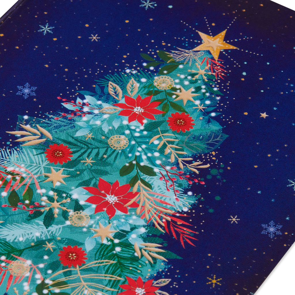 This elegant boxed set features 20 holiday cards adorned with a floral Christmas tree designed by Claudine Rose. Set against a midnight sky, the tree sparkles with poinsettias, greenery, and golden accents—bringing festive magic and refined artistry to every greeting.