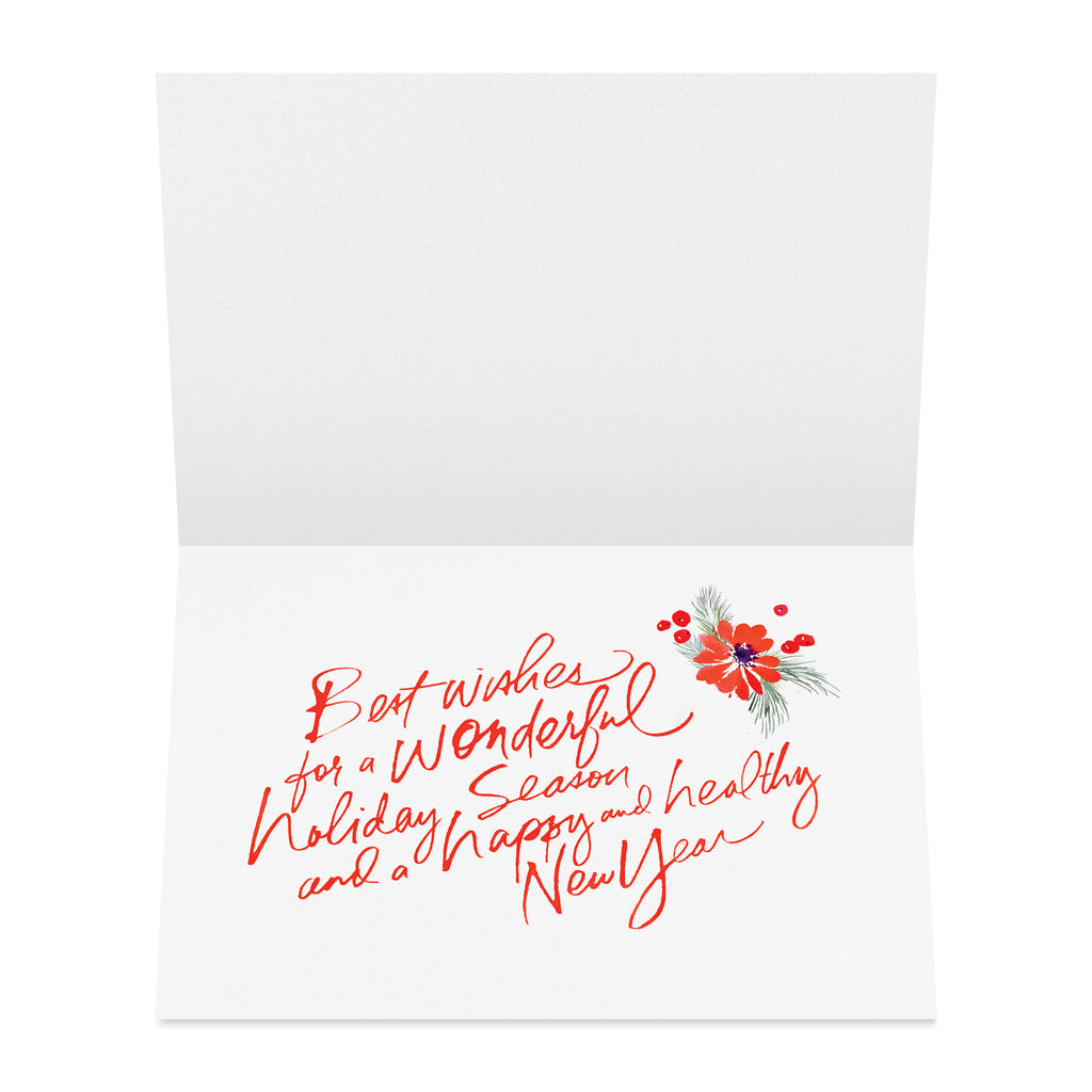 Delicate yet joyful, this boxed set of 20 holiday cards features a hand-painted floral wreath by artist Julie Song. Rich red blooms, greenery, and pine sprigs encircle the elegant “Happy Holidays” message—blending botanical beauty with festive cheer.
