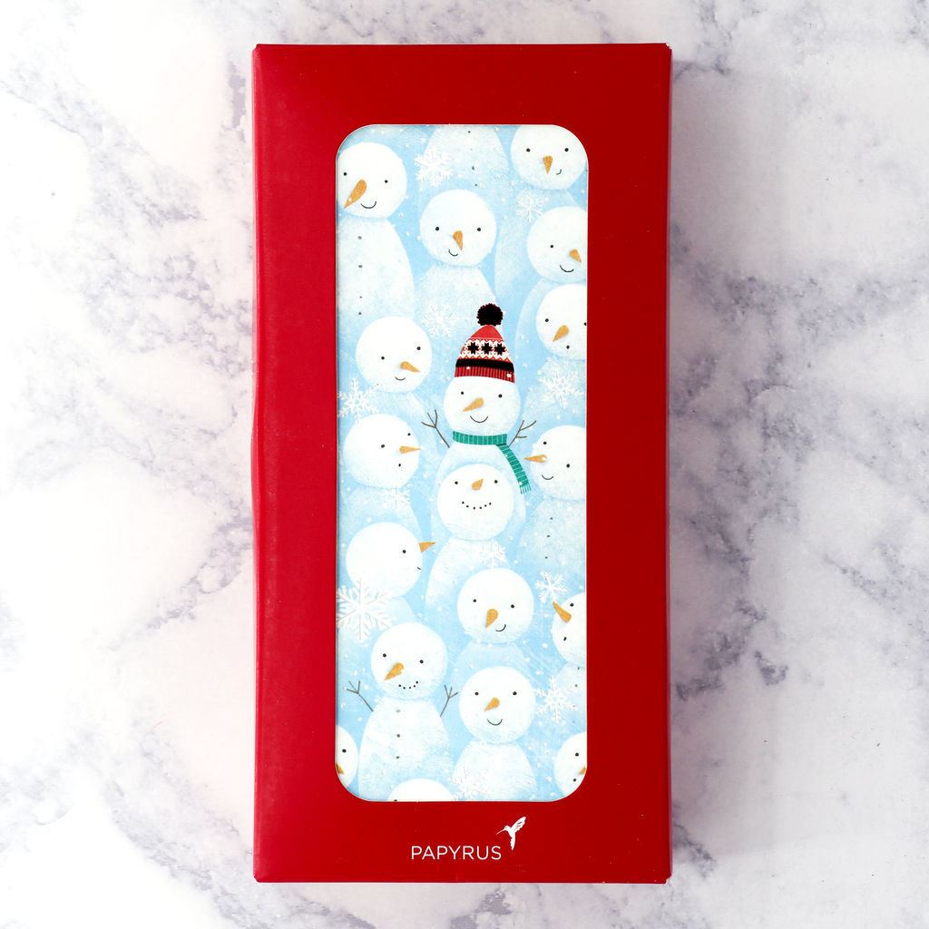 Spread snowy smiles this season with this delightful Snowman Toss boxed card set. A playful crowd of happy snowmen tumbles across a wintry blue background, with one cheerful snowman standing out in a red knit hat and green scarf — adding a whimsical, textured touch with pom-pom and foil details.