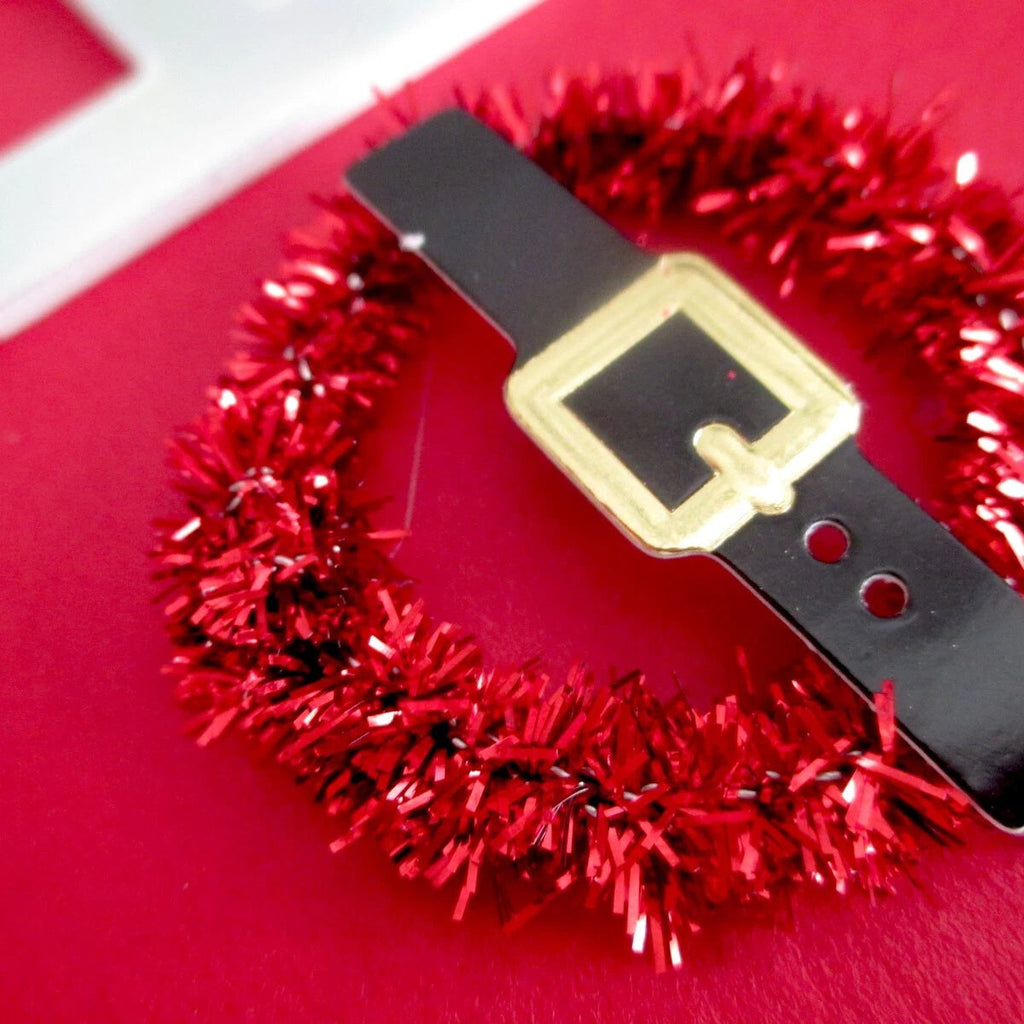 Send festive cheer with a playful twist—and a little something extra inside. This vibrant red holiday card spells out “Ho Ho Ho” using bold iridescent lettering, each “O” replaced with a unique wreath: a sparkly Santa belt, a string of miniature lights, and a peppermint swirl with a red ribbon bow.