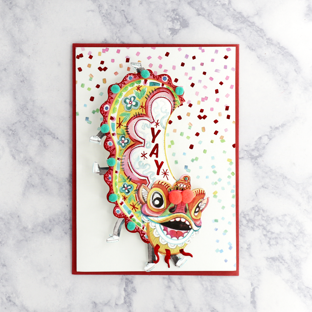 Layered with dimensional embellishments and finished with red foil accents, the card showcases a jubilant lion mid-parade, with the word “YAY” playfully woven into its ornate costume. It’s a cheerful way to share Lunar New Year wishes for luck, joy, and prosperity.