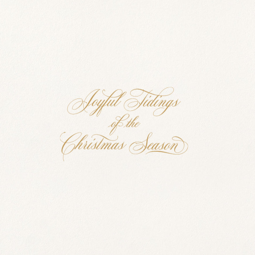 Graceful and serene, this heavenly design captures the quiet beauty of the holiday season. A fair angel draped in flowing robes carries a festive garland of evergreens and holly, delicately foil stamped in gold to highlight her wings and frame her peaceful presence.