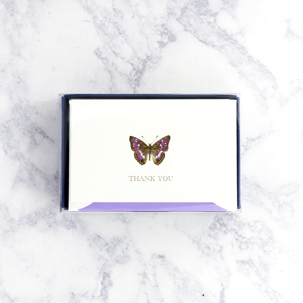 Graceful and refined, the Purple Butterfly Thank You Boxed Notes offer a delicate expression of gratitude. A beautifully detailed butterfly, softly embossed and accented in gold, rests above “Thank You” in elegant gold hot-stamped foil—creating a design that feels both timeless and gently celebratory.