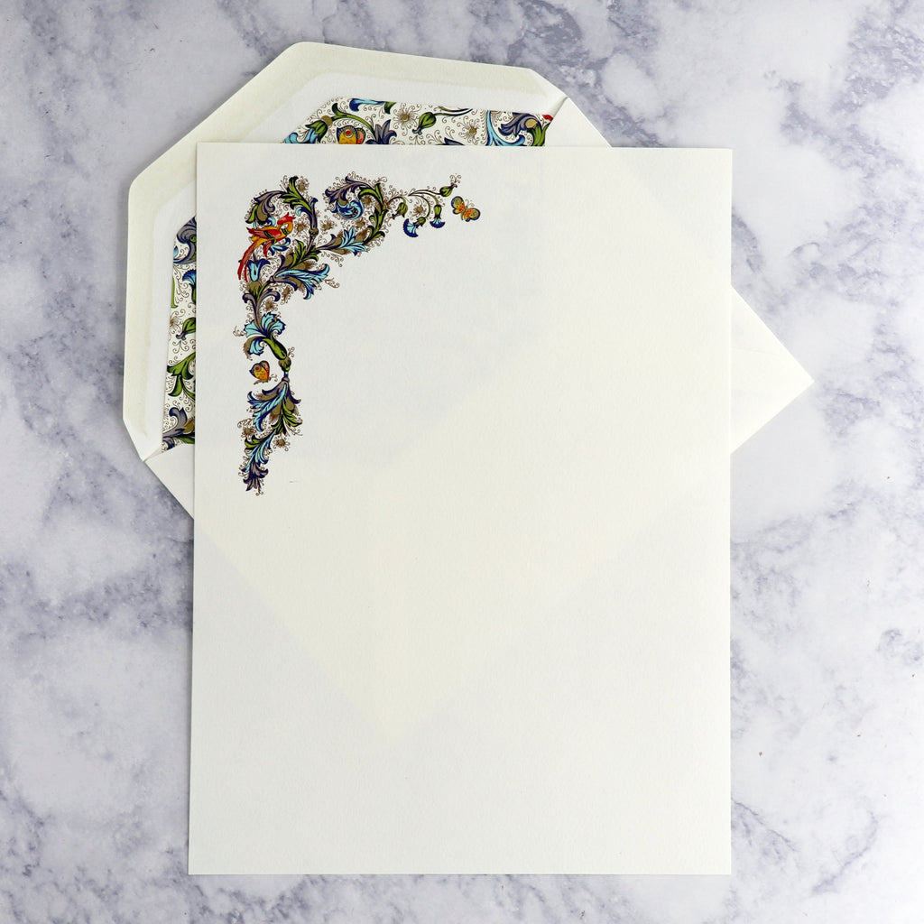 A graceful dance of heritage and artistry, this stationery set features the storied Florentine style, where delicate birds flit among intricate scrolls and vibrant botanical motifs. Each sheet captures a sense of old-world charm, elevated by subtle hints of gold that catch the light with a soft, celebratory shimmer.