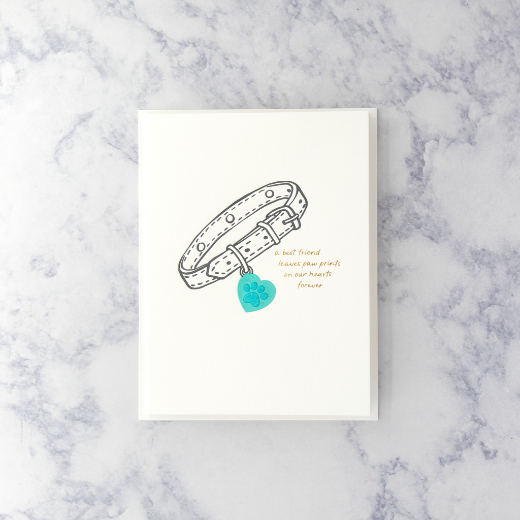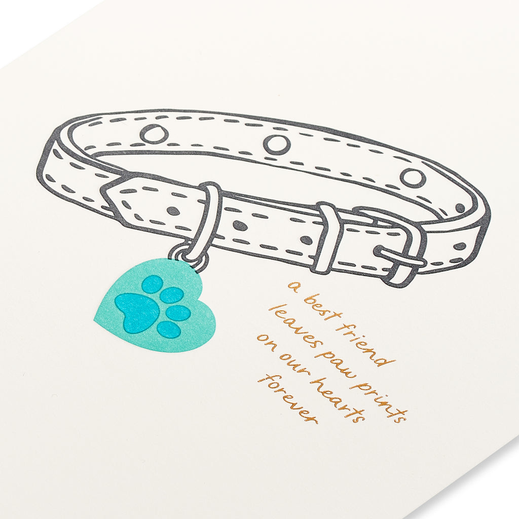 The front of the card features a sophisticated letterpress design, showcasing a detailed illustration of a pet collar adorned with a heart-shaped charm. The letterpress technique creates a deep, tactile impression, adding a sense of texture and depth that enhances the card's elegance. The collar and heart charm symbolize the unbreakable bond and cherished memories shared with the beloved pet.