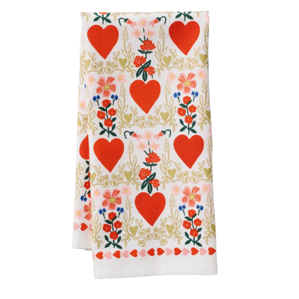 Add a little love to your kitchen with the Juliet Tea Towel, adorned in vibrant hearts and blooming florals. Inspired by folk art and printed in Rifle Paper Co.’s signature style, this towel makes everyday tasks feel special—whether you’re lining a bread basket, drying dishes, or dressing up your oven door.