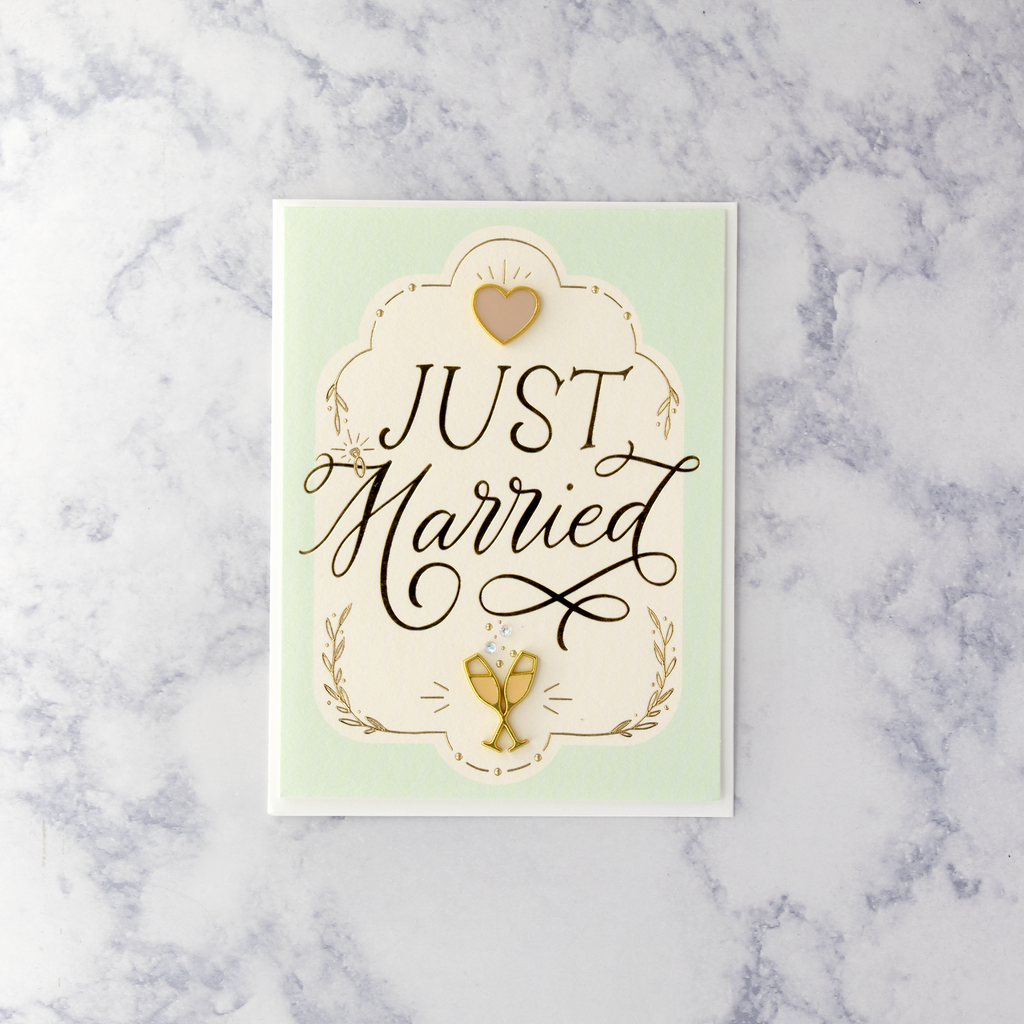 Introducing the "Just Married" Wedding Card, a stunning and celebratory way to congratulate the newlyweds. This exquisite card features elegant lettering that proclaims "Just Married," adorned with luxurious gold foil details that add a touch of glamour and sophistication.