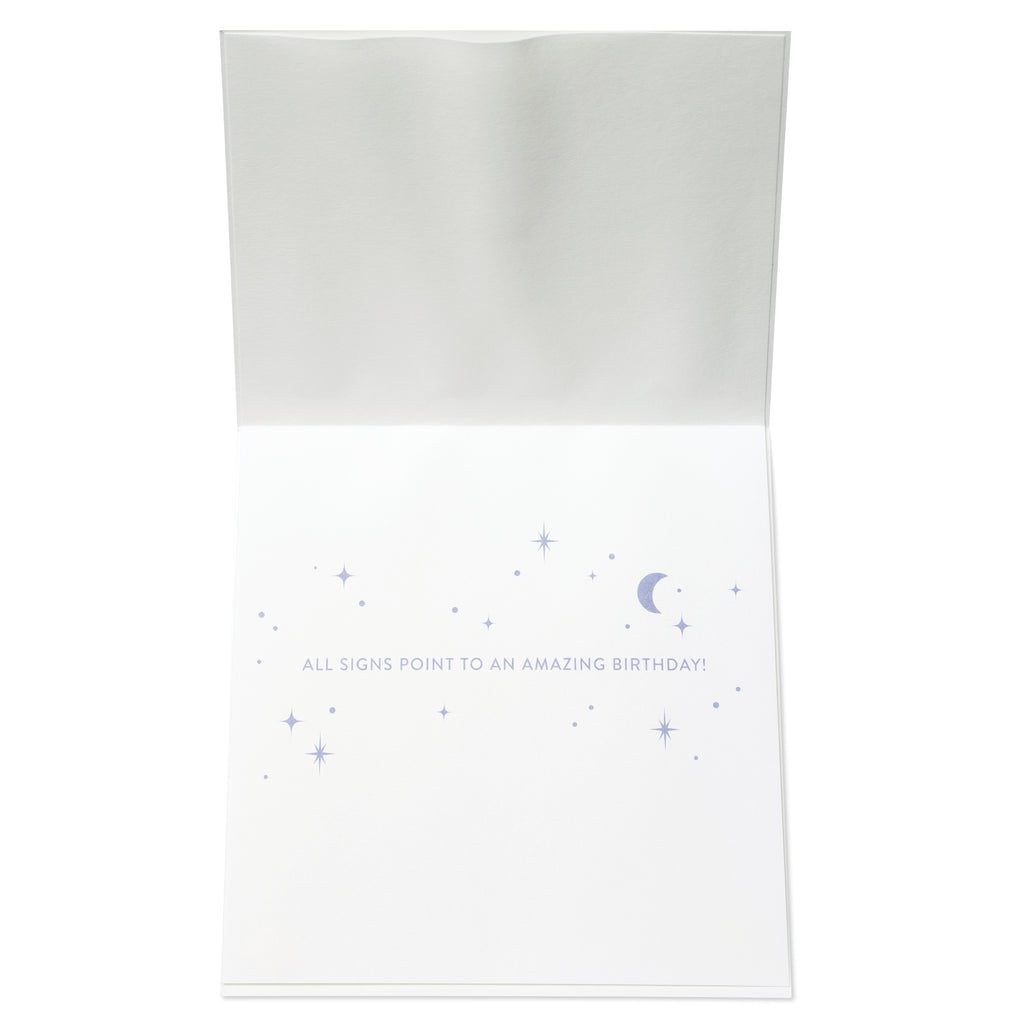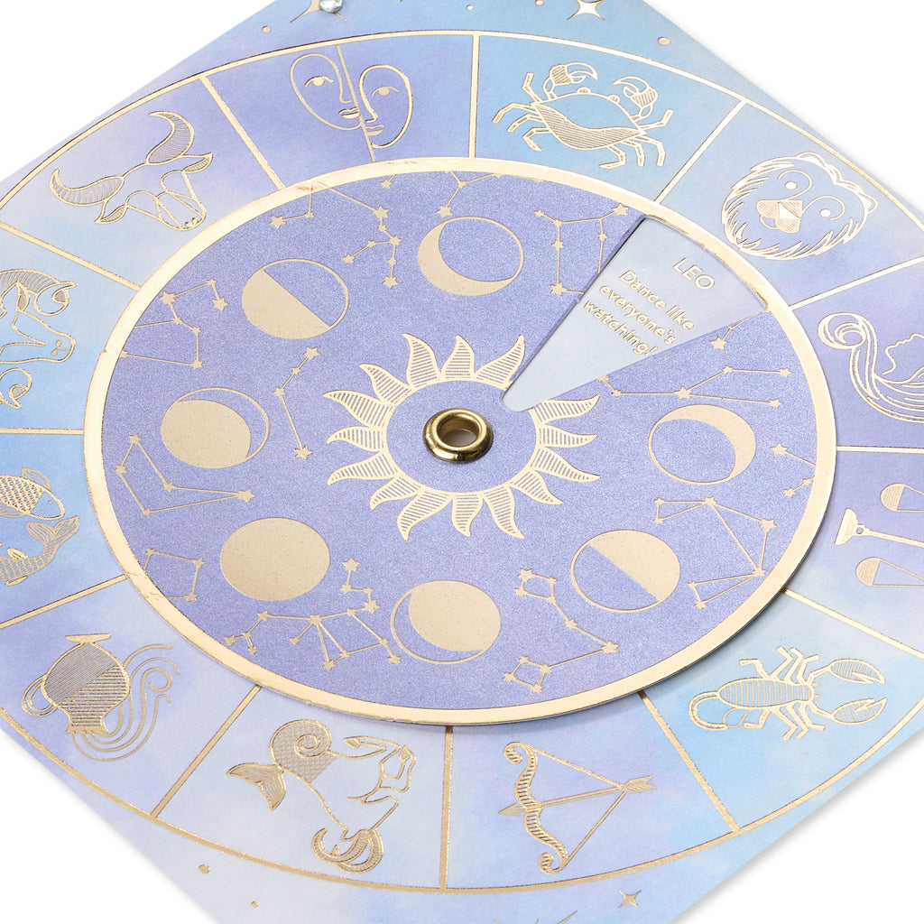 The front of the card features a beautifully embossed and foil-stamped design depicting the twelve zodiac signs arranged in a circular spinner format. Each zodiac sign is adorned with shimmering gems, adding a touch of elegance and mystique to the card. The spinner mechanism allows the recipient to interact with the card, spinning to reveal their zodiac sign and adding an element of surprise and delight.