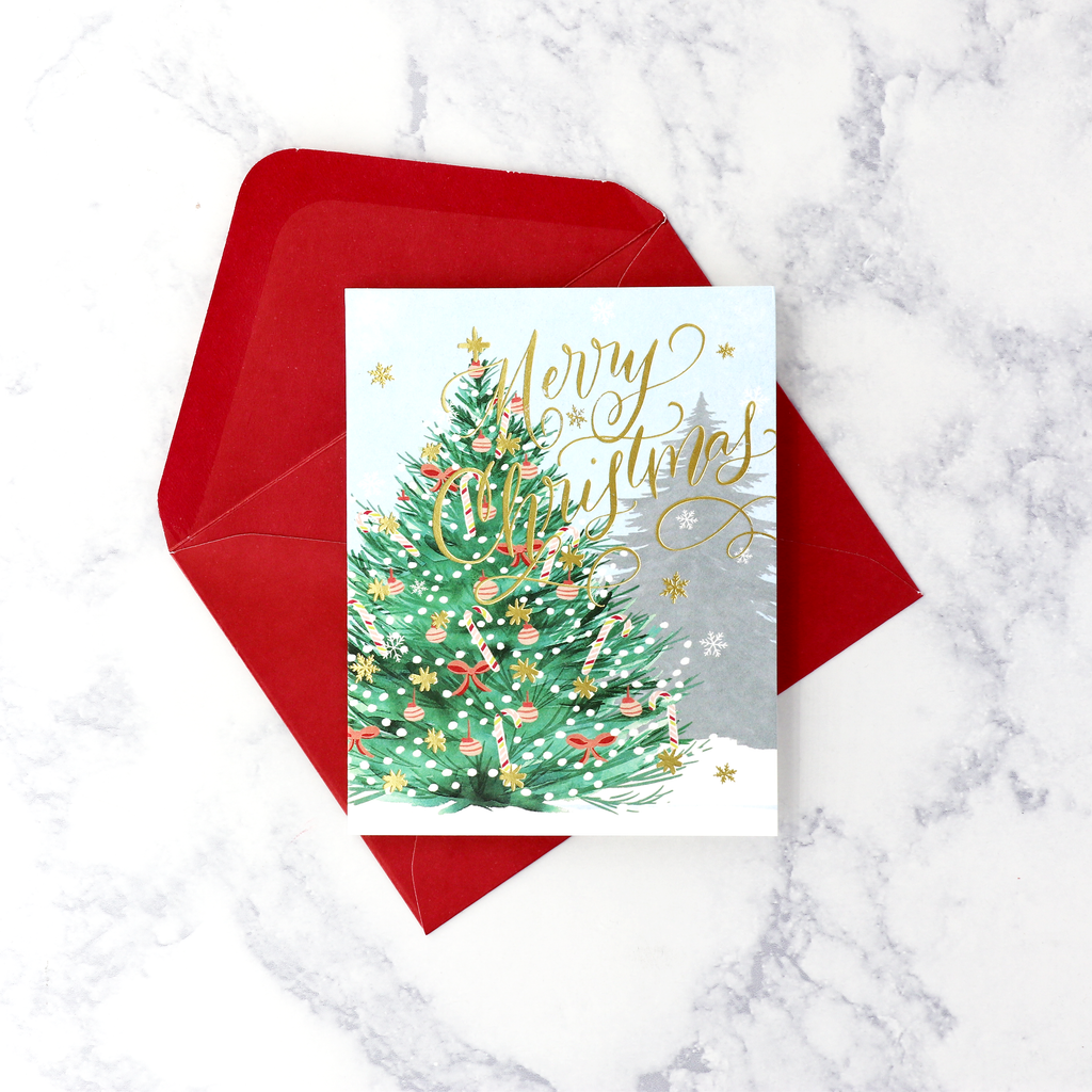 Whimsical and sweet, this festive tree design captures the joy of the season in pinks, golds, and peppermint swirls. Candy canes, baubles, and sugar-sweet ornaments decorate a snowy evergreen, topped with gold foil script that reads "Merry Christmas."