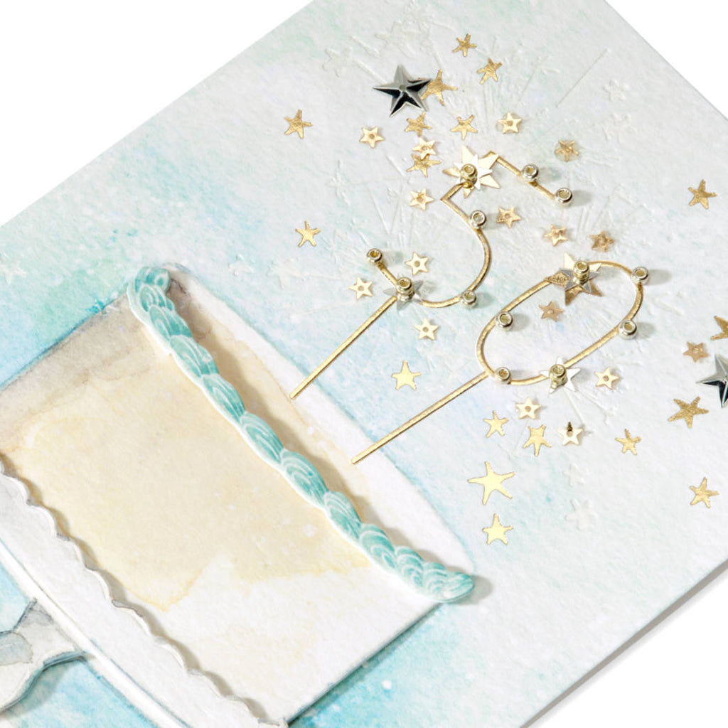 Celebrate a golden milestone with this elegant 50th birthday card featuring a beautifully illustrated cake topped with shimmering “50” sparklers. Scattered gold foil stars dance across the sky, adding a magical, celebratory sparkle to the watercolor-inspired background. Sophisticated yet joyful, this design is the perfect way to honor someone special on their fabulous fiftieth.